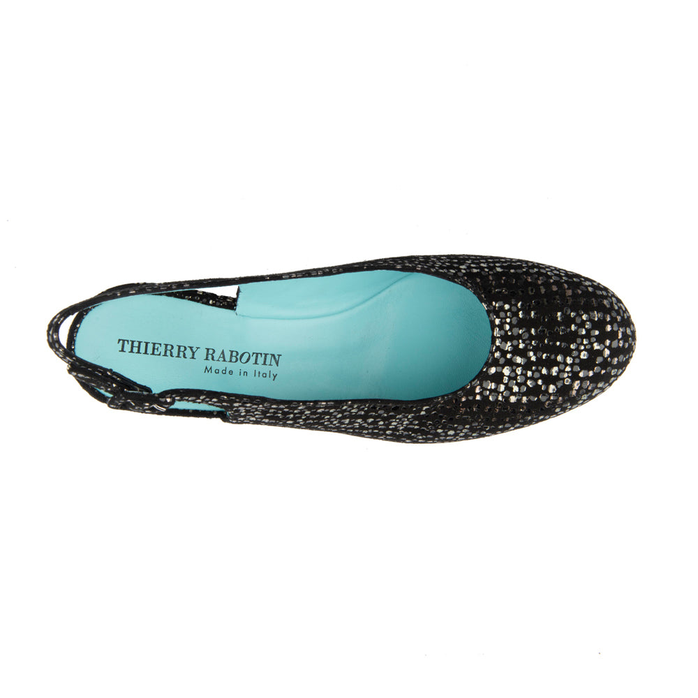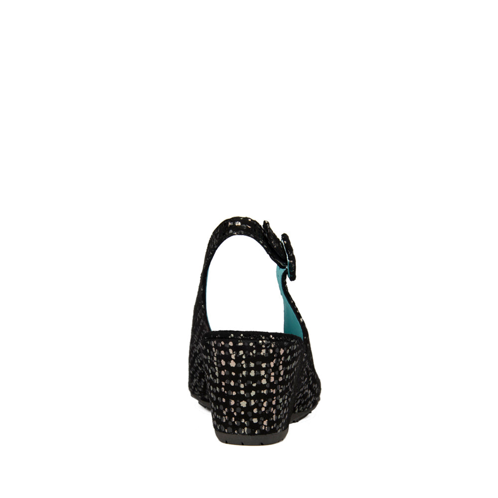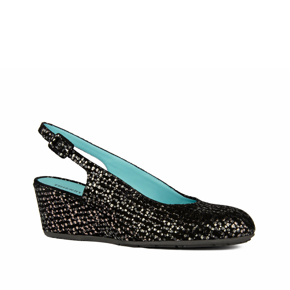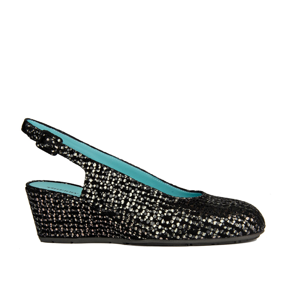 This slingback wedge is done in black suede wuth silver dots.  It has an adjustable back for a snug fit.  Done on a covered wedge for total comfort.