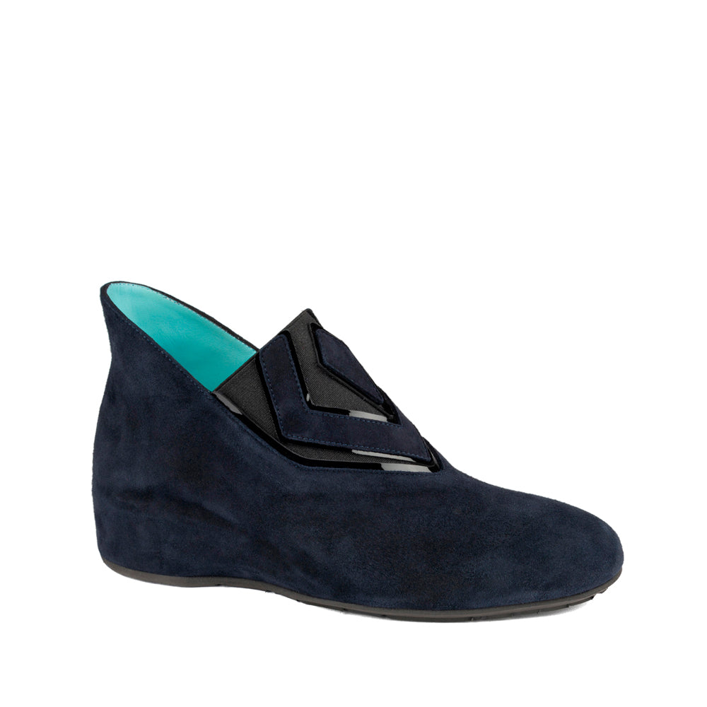 Zanni is an ankle boot made in navy suede and black patent details.  It has side elastics for the best fit and comfort.