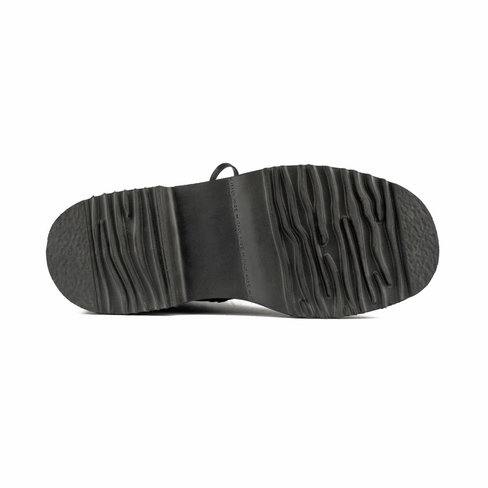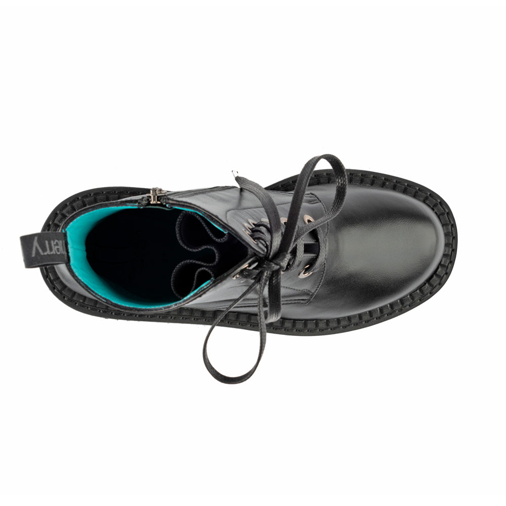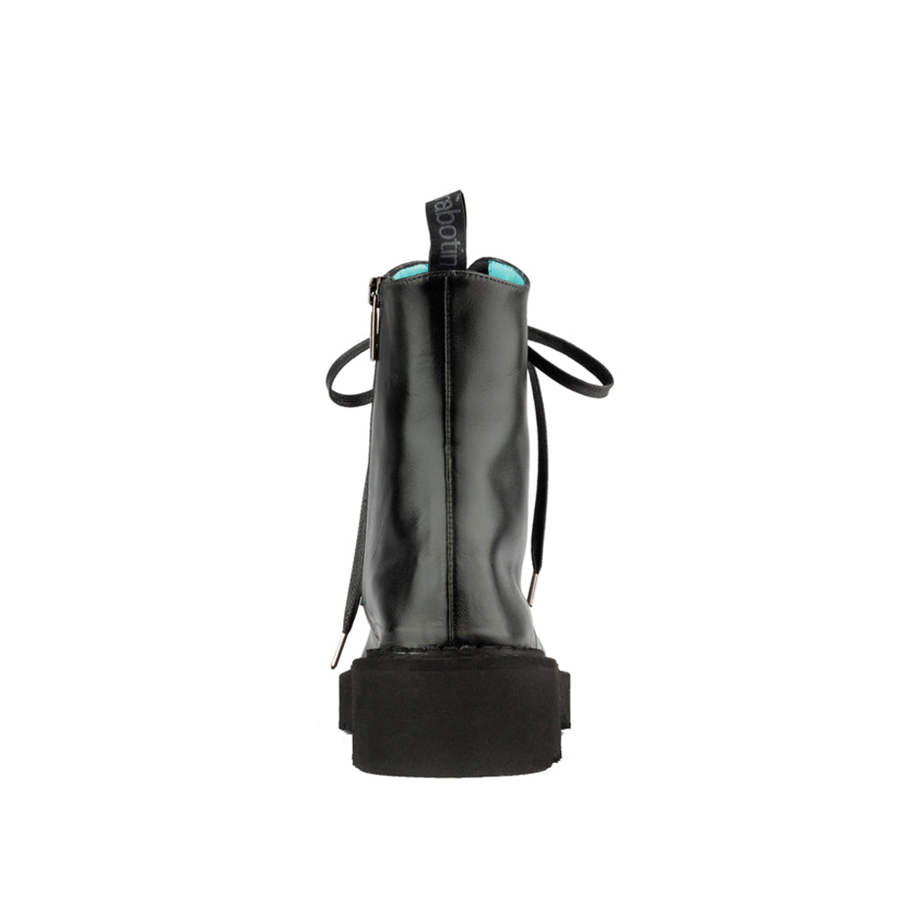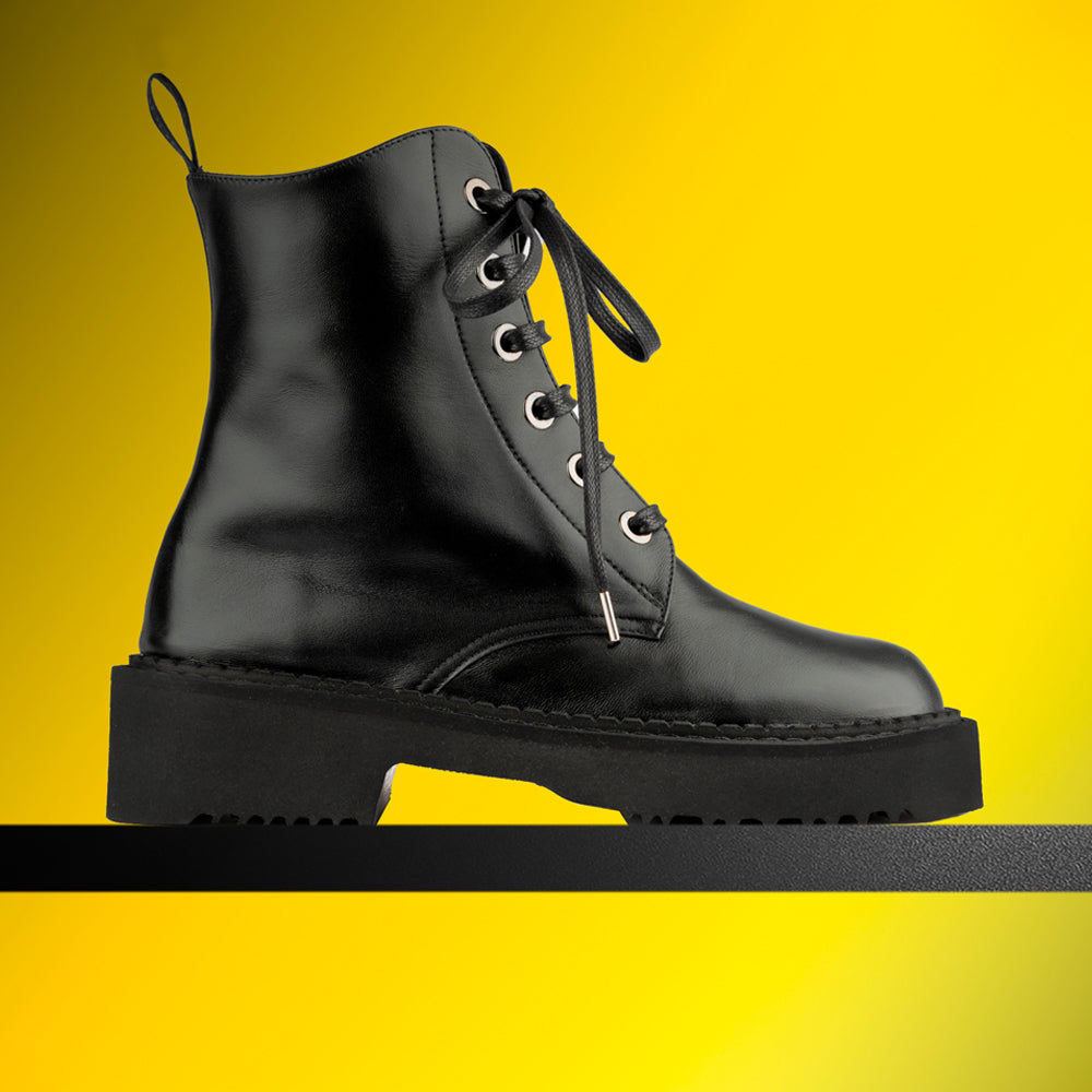 The Zarina Boot in black leather brings a modern edge to a timeless combat silhouette. Crafted with a supple leather upper and smooth leather lining, it’s set on a bold lug sole with a 1.2-inch heel for durability and style. Handcrafted in Italy, this boot is built for confidence with every step.