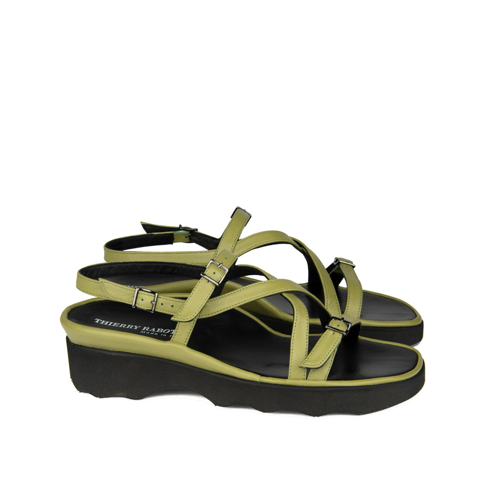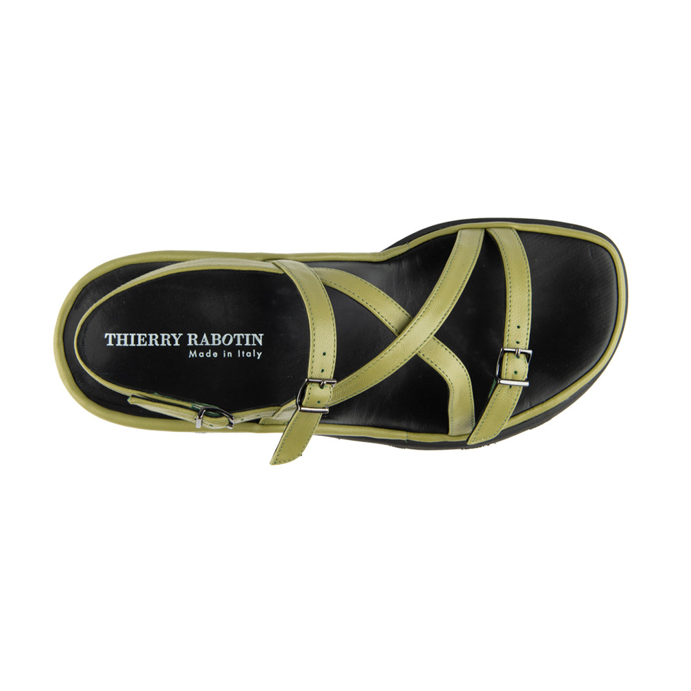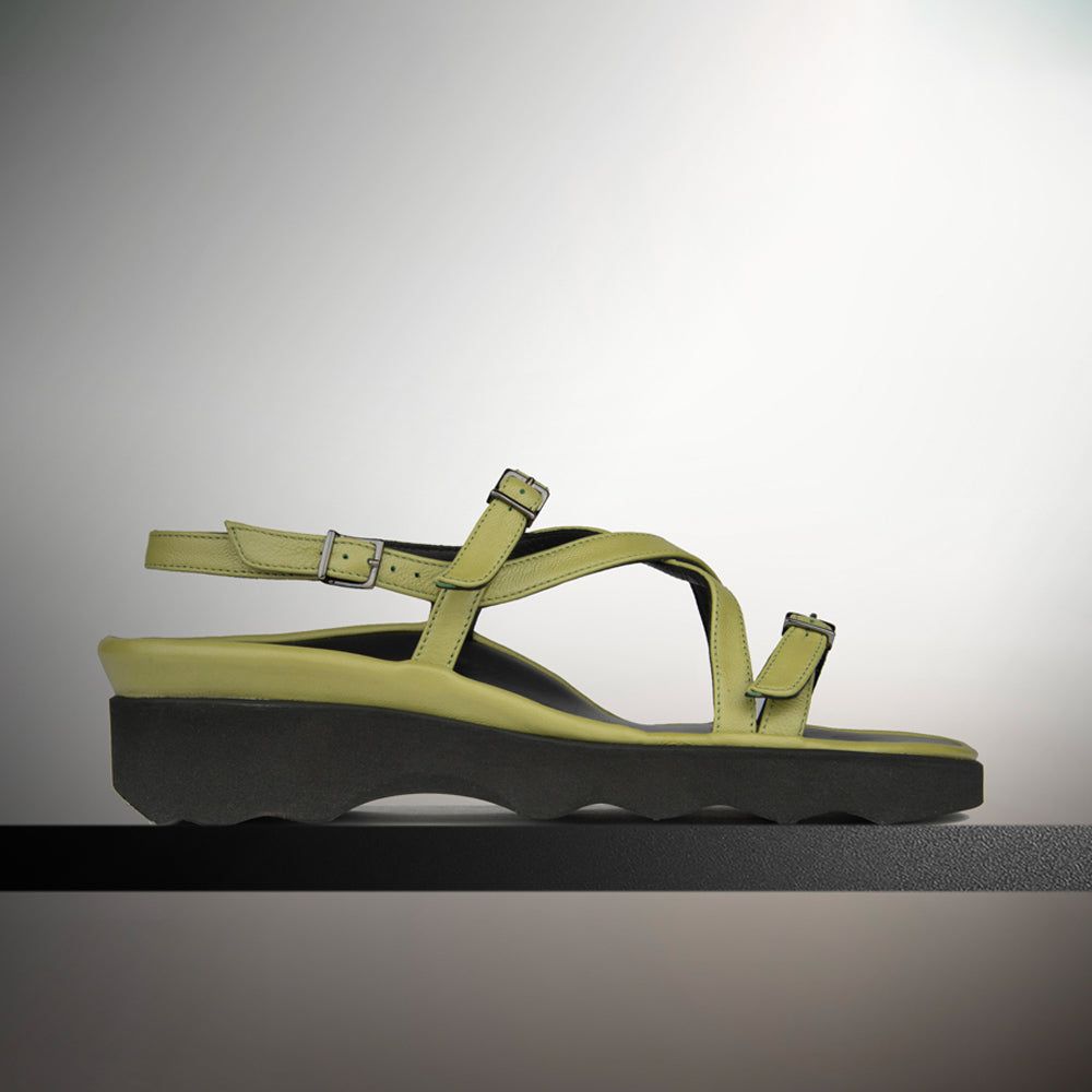 This fashion forward sandal done in olive green has crisscrossing straps and built in orthotic foot bed are sure to brighten every step of every day.