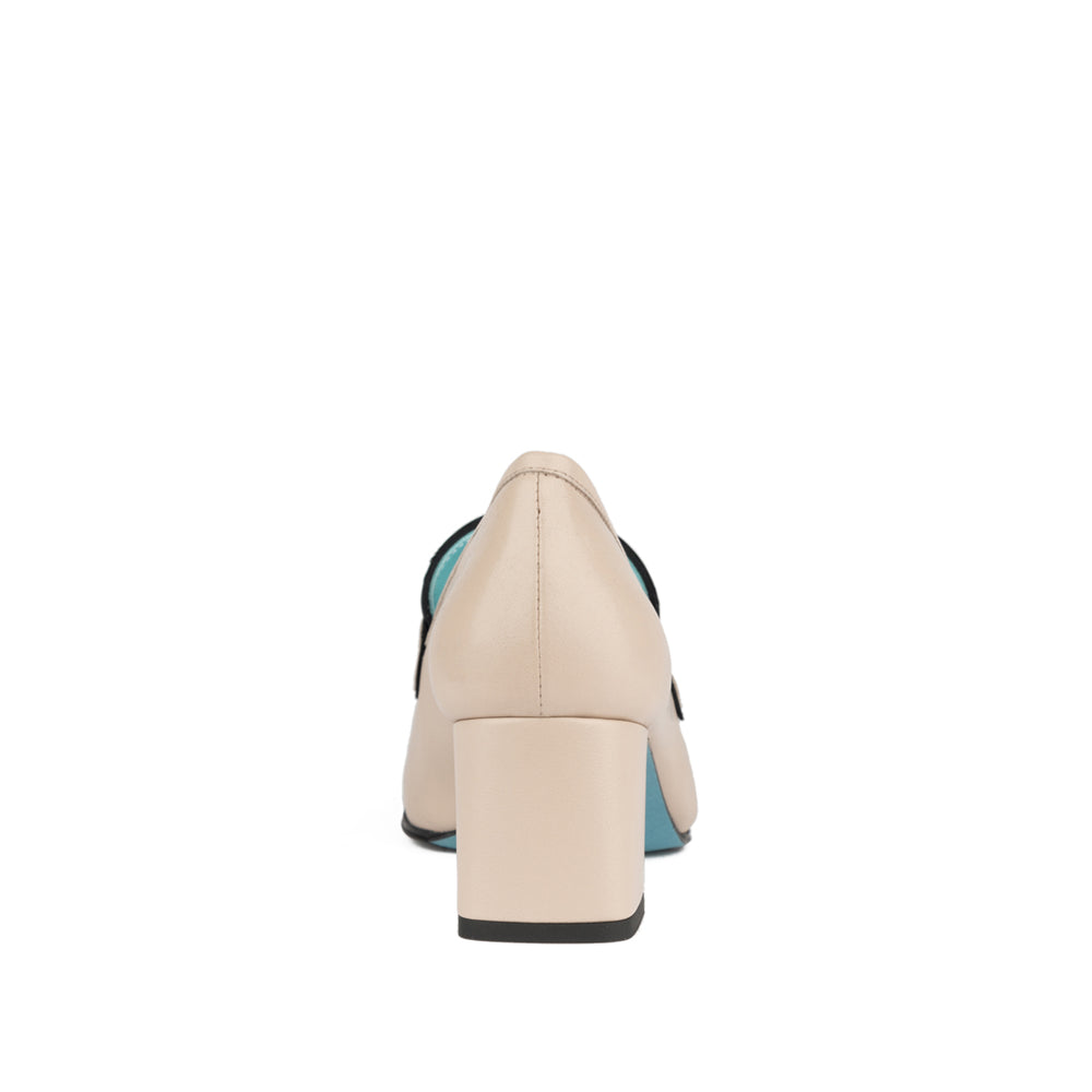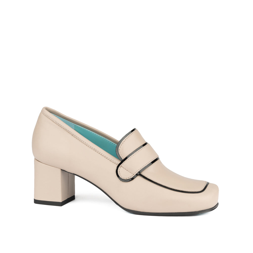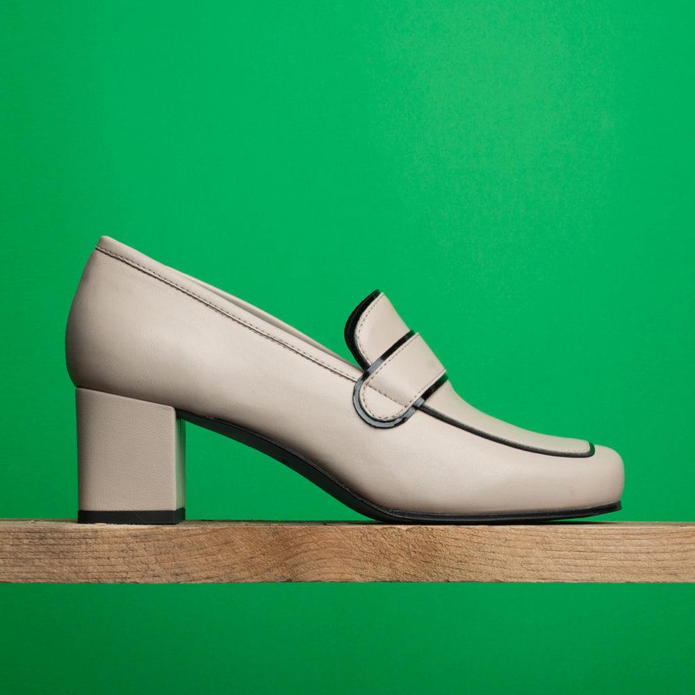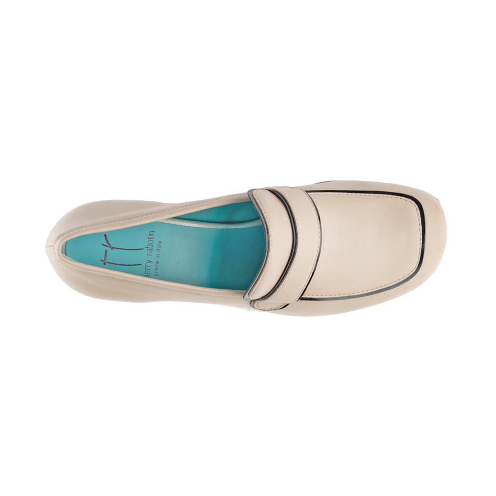 Our new loafer is done in soft Beige Nappa.   Done with a covered heel for a new look.