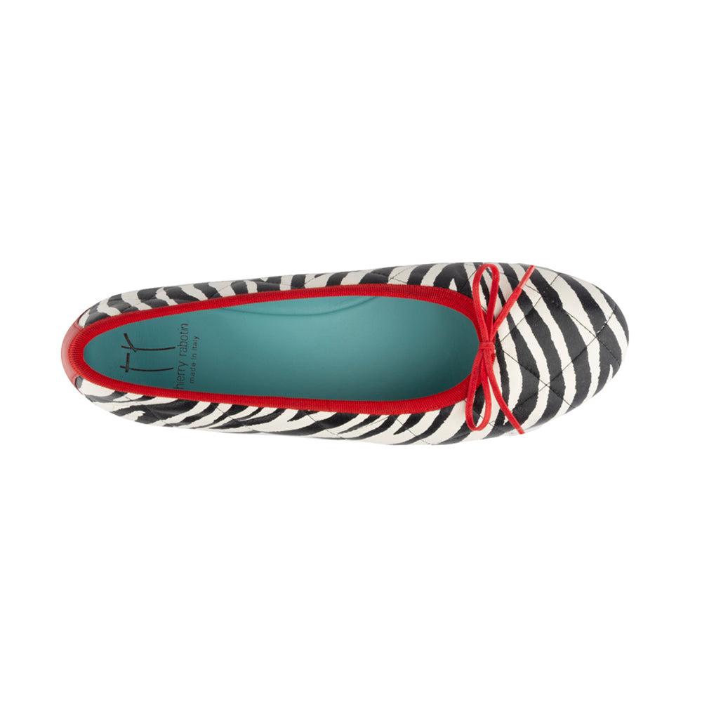 A playful twist on timeless elegance, the Gara ballet flat pairs quilted zebra-print leather with a striking red trim and bow. The soft turquoise lining adds a fresh pop of color, while the flexible sole ensures effortless comfort. A chic everyday companion designed to bring bold character to your step.