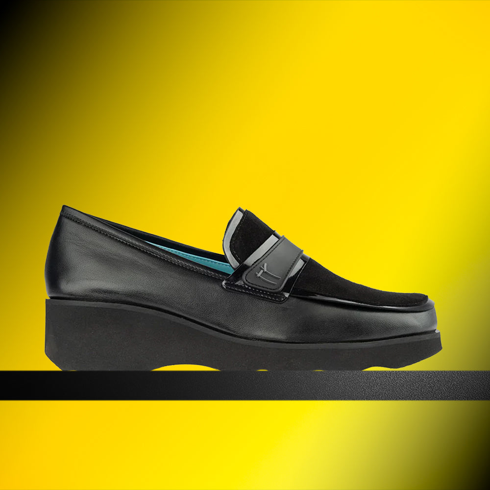 Our new loafer is the perfect combination of timeless style and comfort. Done in Black nappa with a Black Suede plug.  It is trimmed with Black Patent on a stylish demi wedge for a contemporary look. Experience a new level of comfort with this versatile shoe.