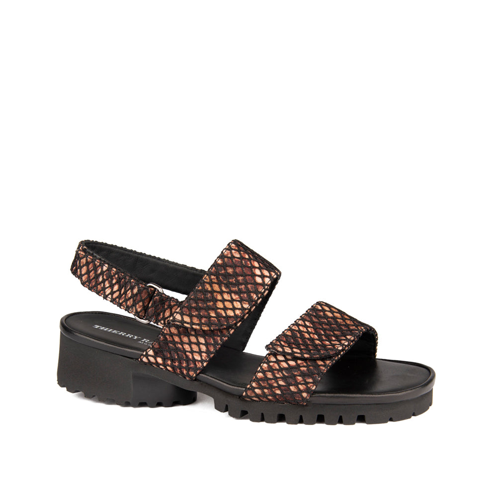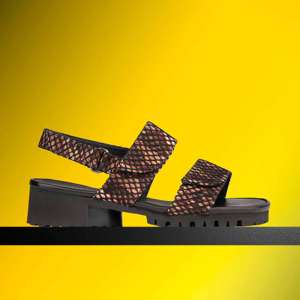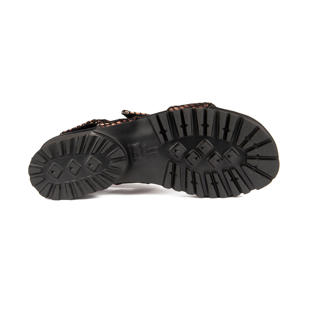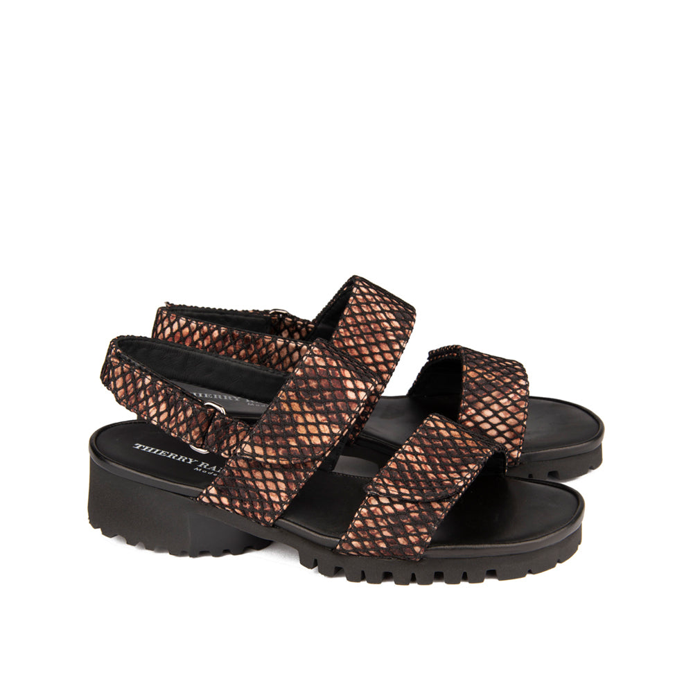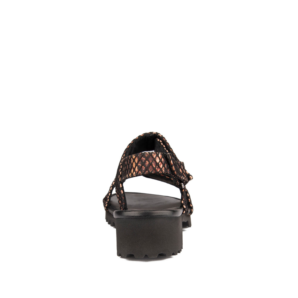 The Sanele Brown Metallic Diamond Fabric is a contemporary, utility-inspired sandal that balances a bold aesthetic with everyday comfort. It features a striking brown metallic fabric with a geometric diamond-patterned weave.