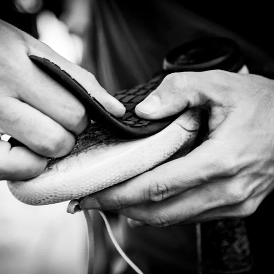 During the sewing stage, the full grain nappa lining is attached like a ‘sac’ along its edge permitting to build the shoe without rigid components such as the insole and the shankpiece. The shoe becomes lighter and allows the foot to move naturally.